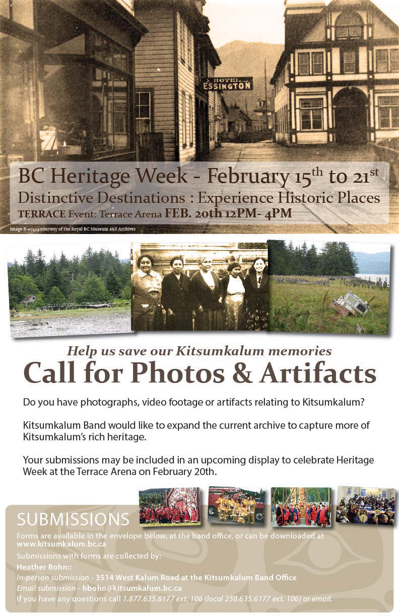 Promoting BC Heritage Week and seeking photos and artifacts to expand the Kitsumkalum archives. Poster created in Adobe Illustrator.